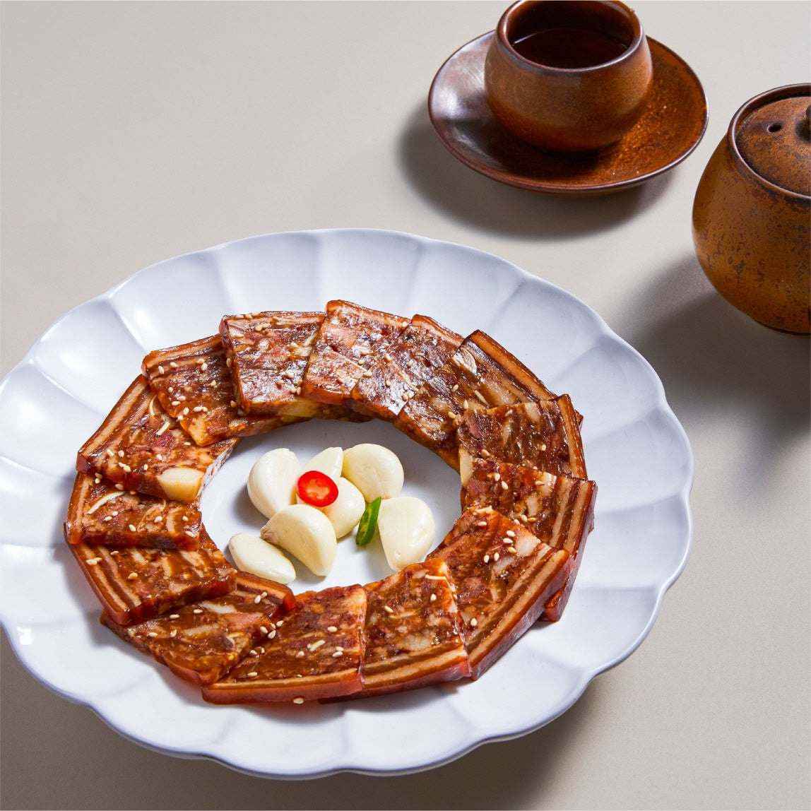 Chewy boiled meat slices made from pig's head and skin.